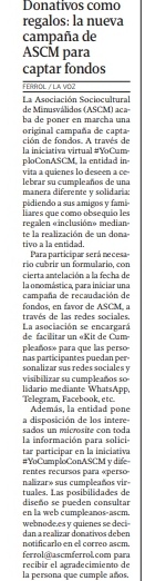 - La Voz de Galicia, 2020-08-01 "Donativos como regalos: la nueva campaña de ASCM para captar fondos"